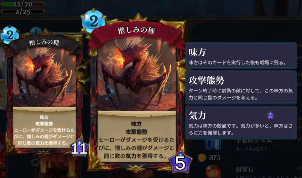 特に、今回ラスト手前で購入した憎しみの種というカードは、被ダメージにより火力が上がっていくため、防御面が脆い攻撃重視のパーティー構成と非常に相性が良い感じがします。